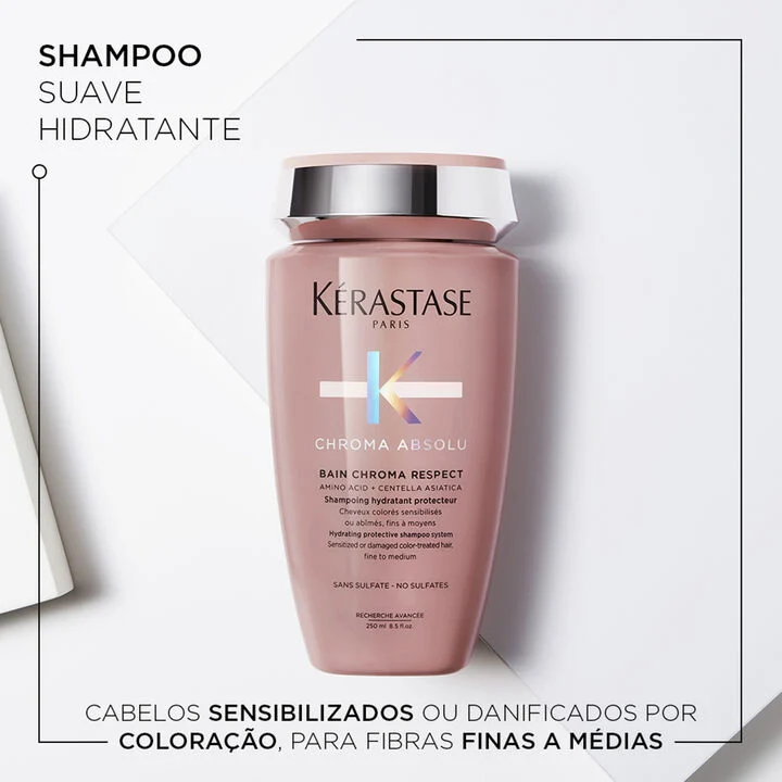 Bain Chroma Respect é um shampoo para cabelos coloridos danificados ou sensibilizados, especialmente adaptados para cabelos finos a médios.