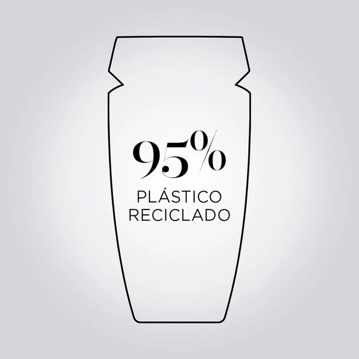 A embalagem de shampoo de 500ml reutilizável, feita com 100% de plástico reciclado*, em uma fábrica que utiliza 100% de energia renovável , pode ser reabastecida com o refil de shampoo correspondente, produzido com -82% de plástico na embalagem** em uma fábrica com ciclo fechado de água.